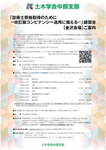 土木学会中部支部では、技術士を目指す皆様をサポートするため、出願対策から筆記試験で重視されるテーマまでを網羅した講習会を開催します。